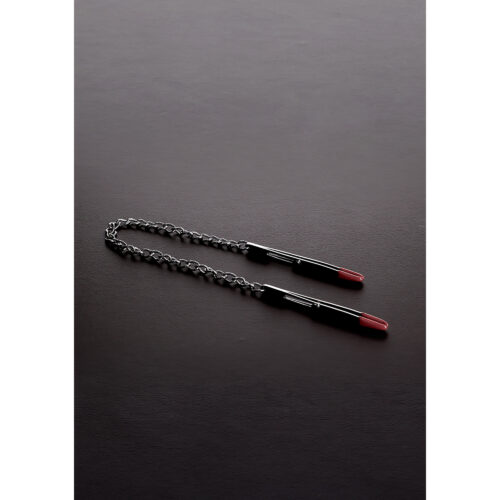 Zware Tweezers Tepelklemmen met een stevige schakelketting, die anders zijn dan de traditionele pincetklemmen. De druk wordt geregeld door de middelste knop in de richting van de punt van de klem te schuiven. Gemaakt voor gevorderde BDSM-speler.