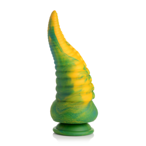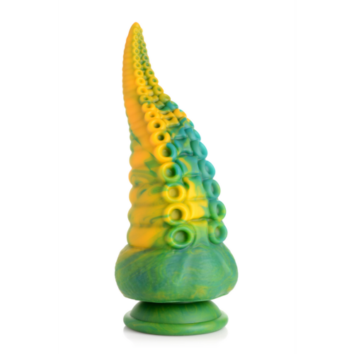 - Fantasie monster dildo: deze taps toelopende tentakel heeft een gemarmerd groen, geel en blauw patroon dat uniek is voor elke dildo. De taps toelopende tip eindigt in een kleine, ronde punt en verbreedt naar een grote, ronde basis. Aan één kant van de schacht bevinden zich twee rijen cephalopod zuignappen met vlezige richels ertussen en een rij geribbelde, cirkelvormige ringen die zich uitstrekken van de basis tot de punt van deze S-vormige, gebogen tentakelarm monster dildo.