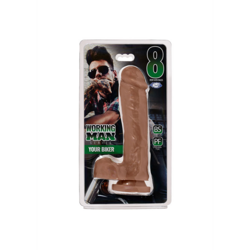 YOUR BIKER is a 8 inch dong featuring a realistic head and veined shaft, full balls and a suction cup base. Use alone or with a partner – the suction cup base can be used on any flat surface, or inserted in a harness. Odor-free, this dong is made with body safe, phthalate-free, non-toxic PVC. For use with water-based lubricants only.